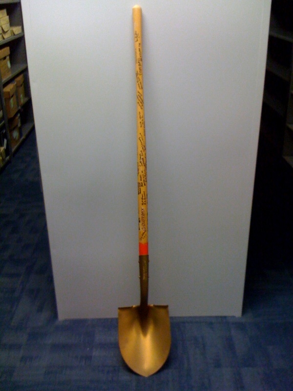 We are rather pleased to announce an unusual arrival to the archives. Among a collection of materials related to the construction of the ATLC was this autographed groundbreaking shovel! Thanks to Doug Heesten in Institutional Advancement for sending these materials our way! Now…where do I put it?