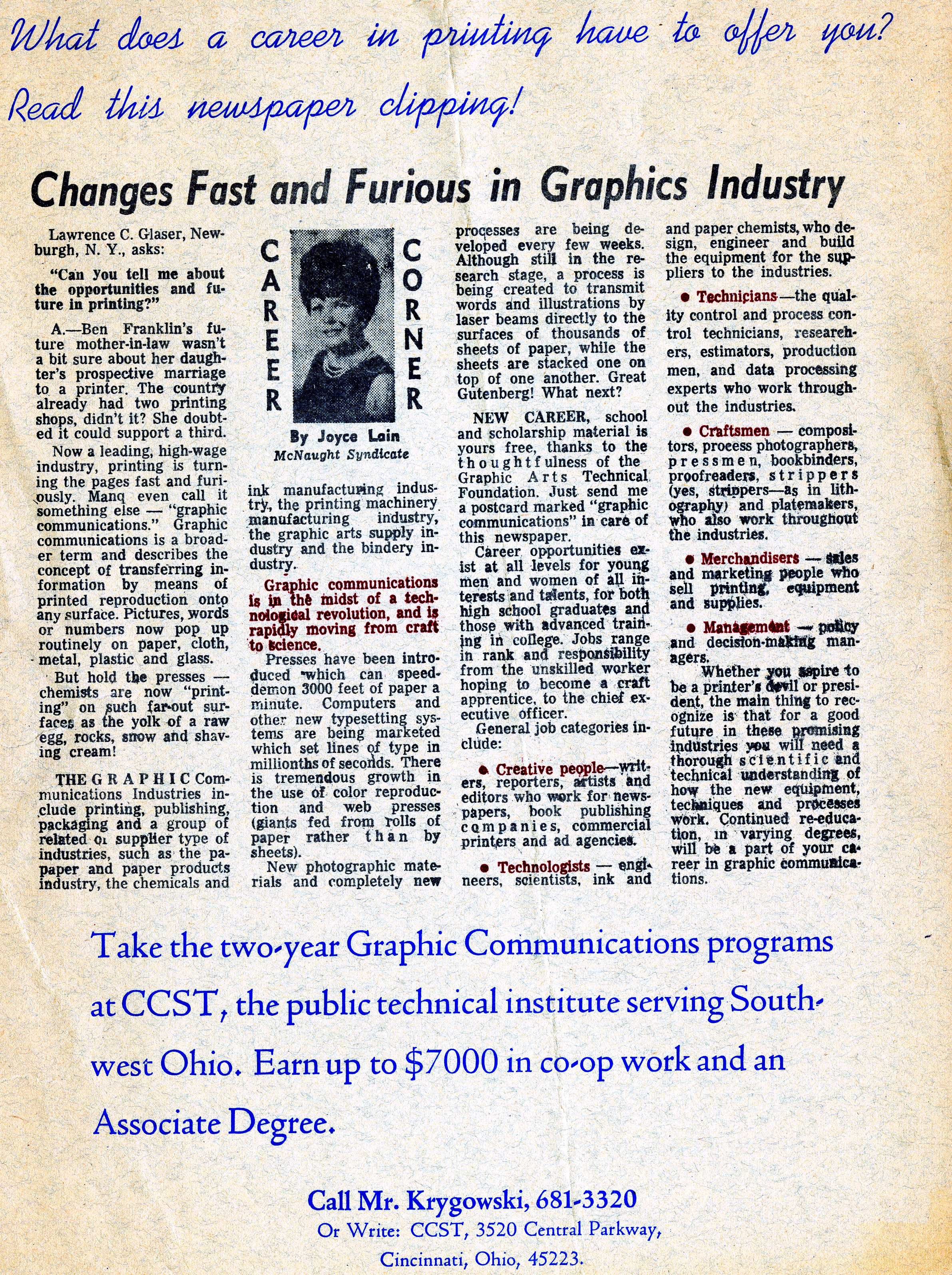 Thought I would share this ad for CCST, ca. 1968, today. We have a really fantastic collection of advertisements in the archives. They date back to 1966 and are in a variety of formats–film, audio reels, cassettes, print, video, Oh my!