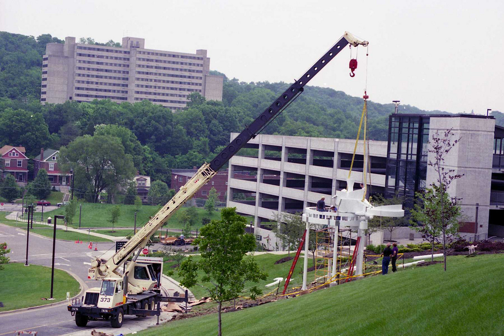 The sculpture was installed in June 1997 and it was designed to welcome visitors and to encourage students to look out from it across the landscape. The work is “lighthearted” and “spontaneous,” according to its creator. Through the sculpture, Black sought to emphasize the vitality of the career-oriented college, the outdoor beauty of the campus, and an integration of classroom and environment.
