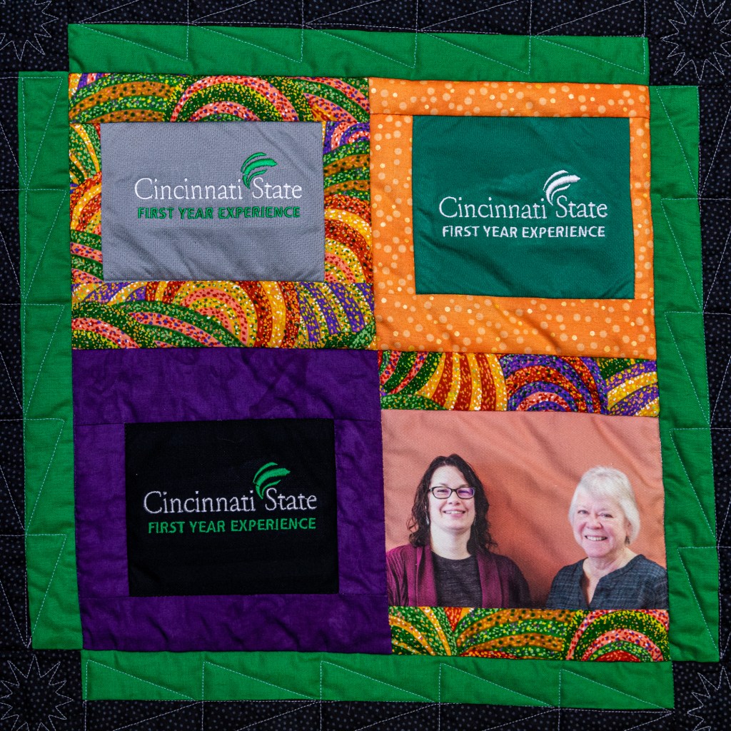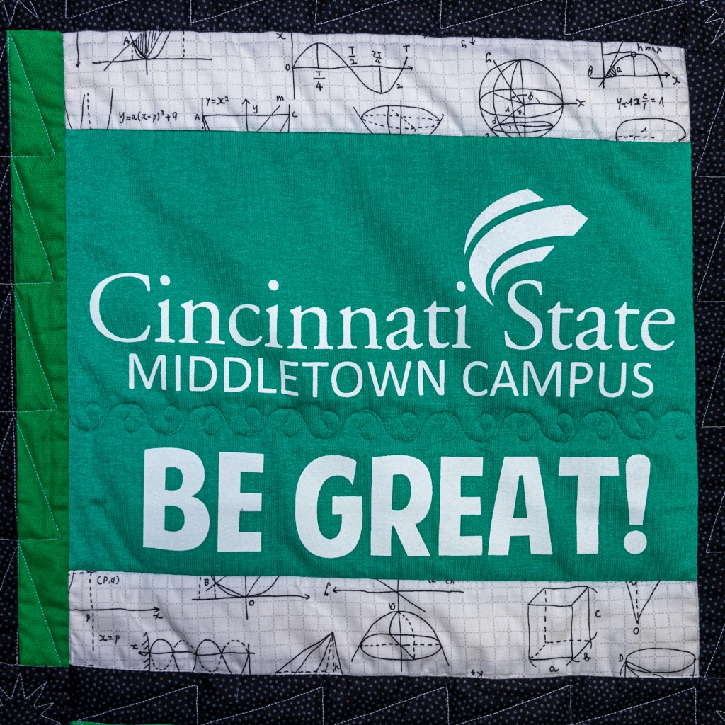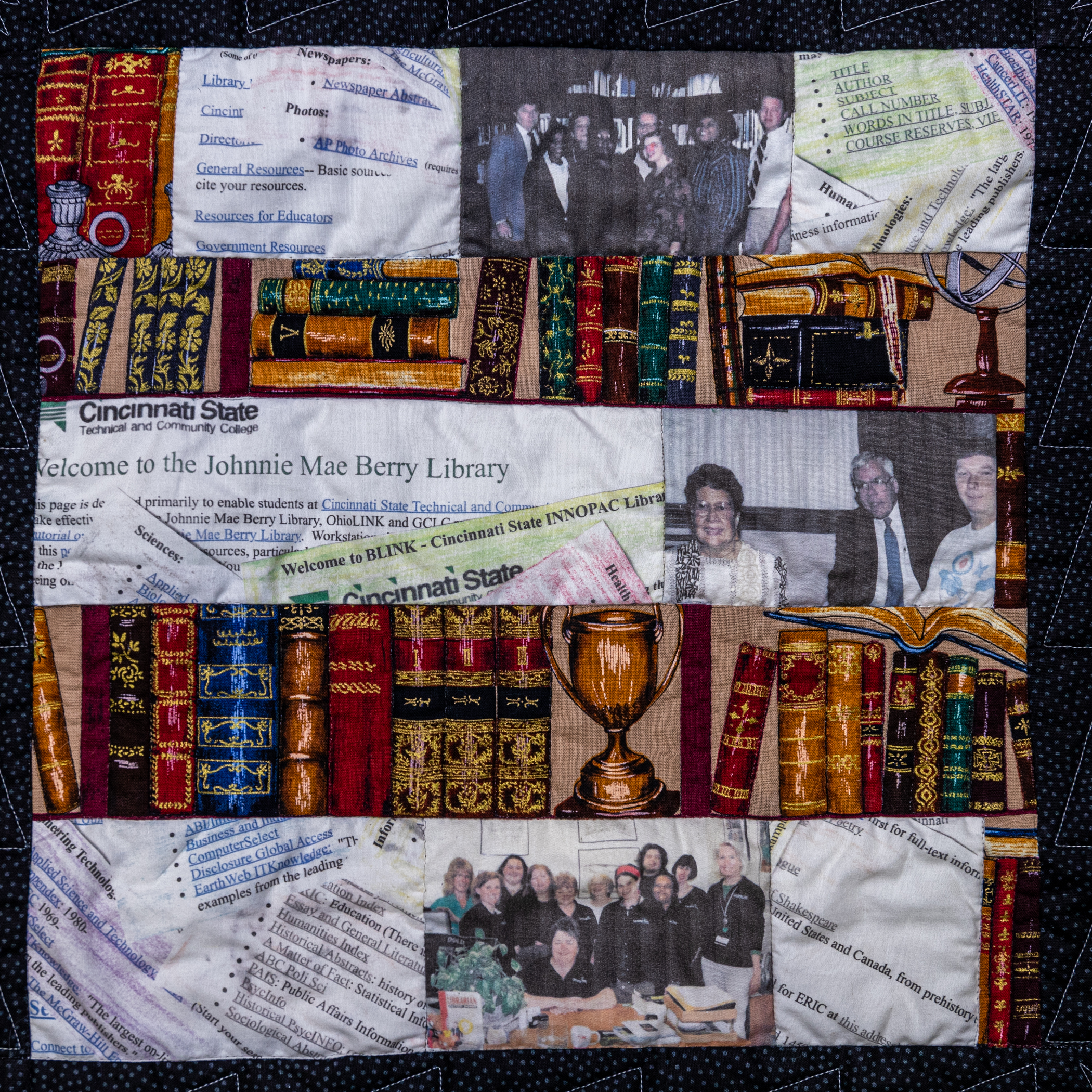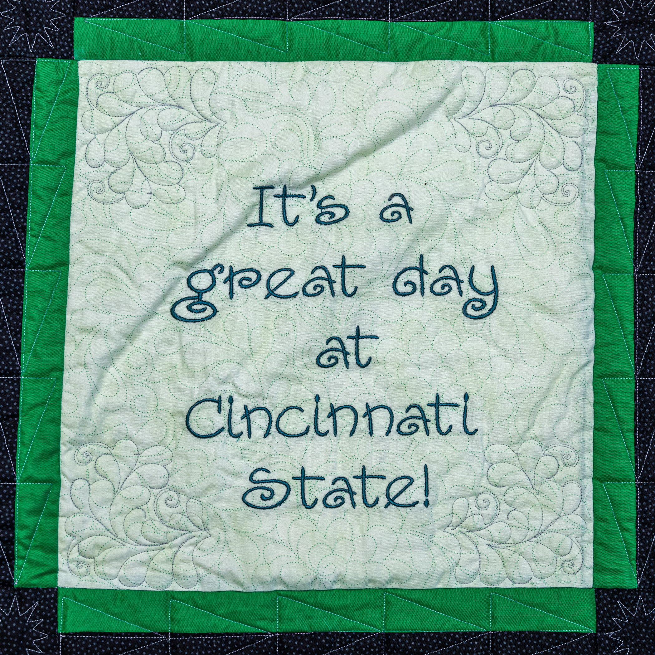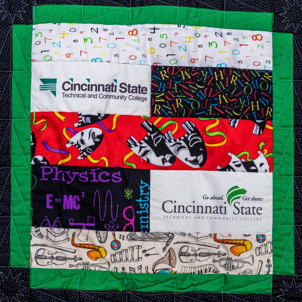 Early Childhood Parent Resource Center created 2019. Made by Sandi OwensEarly Childhood Education Degree Program NAEYC Accreditation 2018. Made by Sandi OwensIt’s a Great Day at Cincinnati State embroidered block. Made by Debbie BogenschutzFounder Tom Stark and His Family of Alumni photograph and embroidery with scientific background fabrics. Designed by his daughter Kristi Stark Drout and made by Debbie BogenschutzA circuit board representing the Engineering Technologies Division. Made by Debbie Bogenschutz who remembers many ET students working on their circuit boards in the Library.2019 Cincinnati State Collegiate Leadership Competition (CLC) Green Team. We were the only two-year college that competed in Cleveland in 2019 and gave all the four-year schools stiff competition. Photograph provided by Julie McLaughlin, Chair. Made by Diane StumpA pieced helicopter representing the Aviation Program. Made by Diane Stump.Photo of the Eileen Berke Occupational Therapy Center with embroidery. Made by Claudia Miller, Chair of the OTA Program.Nursing: Providing Ladders to Success and listing the programs provided. Made by Alice Palmer, retired Program Chair.William H. Mallory Early Learning Center established 1987 and NAEYC accredited. Made by Sandi OwensScience Olympiad 1990-2006 featuring photos of the various competitions. Designed by Peggy Rolfsen and made by Debbie Bogenschutz.The Midwest Culinary Institute logo surrounded by fabrics representing many aspects of the programs. Made by Joyce Rimlinger in consultation with Betsy Lasorella.Photos of the Tutoring Center featuring Debbie Greenlee and various working tutors. Made by Diane Stump.Memories of the Men’s and Women’s Basketball teams with photos, a logo, and basketball fabric. Inspired by Theresa Check former Athletic Director and made by Diane Stump.Flowers and Bees representing the Horticulture Program and our beautiful grounds. Made by Diane Stump.Fabric found by Cindy Kief on a mission trip which represents Occupational Therapy success.Many Facets of the Library with hand embroidery representing both books and technology available through the library. Made by Karen Douglas of the Cincinnati State Library.A pieced Mortar Board with a Cincinnati State tassel representing the success of out mission. Made by Debbie BogenschutzThe Be Great Logo with photos of the Middletown staff and building provided by Tom Hale and Dave Beeman. Made by Joyce RimlingerThe Cincinnati State Library over the years with photos from various moments in time and samples of library handouts as background fabric. Made by Debbie Bogenschutz.Leadership Certificate tee shirt provided by Julie McLaughlin. Block made by Diane StumpThe Accounting Program represented by faculty photos and handouts provided by Yvonne Baker. Assembled by Joyce RimlingerCapitol C made of chemical elements fabric on a background of letters by Gail Hale-Griffin, Financial AidEarth Day tee shirt provided by Ann Gunkle, Chair of the Environmental Technologies Program. Block assembled by Joyce RimlingerAmerican Association of University Professor logos from polo shirts and the newsletter spanning the history of the AAUP. Logos and shirts provided by Pam Ecker; the block was pieced by Joyce RimlingerCincinnati State Middletown Campus Be Great tee shirt logo. Made by Joyce RimlingerSeveral Cincinnati State logos with fabrics representing liberal arts and sciences offerings. Made by Joyce RimlingerCelebrating SO Years made with embroidery on fabric by Debbie Bogenschutz.Cincinnati Cooperative School of Technology, Cincinnati Technical Institute, and Cincinnati Technical College logos provided by Pam Ecker and pieced with “technical” fabric by Joyce RimlingerCincinnati State National Championship Golf team photo with a background of golf fabric made by Diane StumpThe Switchboard our long-time communications hub using a photo and various fabrics. Made by Carolyn LaRose, retired long-time switchboard operator.Cincinnati Technical College: The First Decade by Clifford House is represented in a book block with embroidered title and author. Made by Debbie Bogenschutz.The Financial Aid process featuring the FASFA logo and various fabrics. Made by Destiny Howard of the Financial Aid Office.Cincinnati Police Academy housed on the Cincinnati Technical College Campus from July 31, 1972 to June 25, 1993, using police insignia and embroidery. Made by a friend at the direction of Tom Bauer.The First Year Experience using insignia from several shirts and a photograph of Julie Mclaughlin, Chair, and Diarie Stump, Founder and Chair. Made by Diane Stump