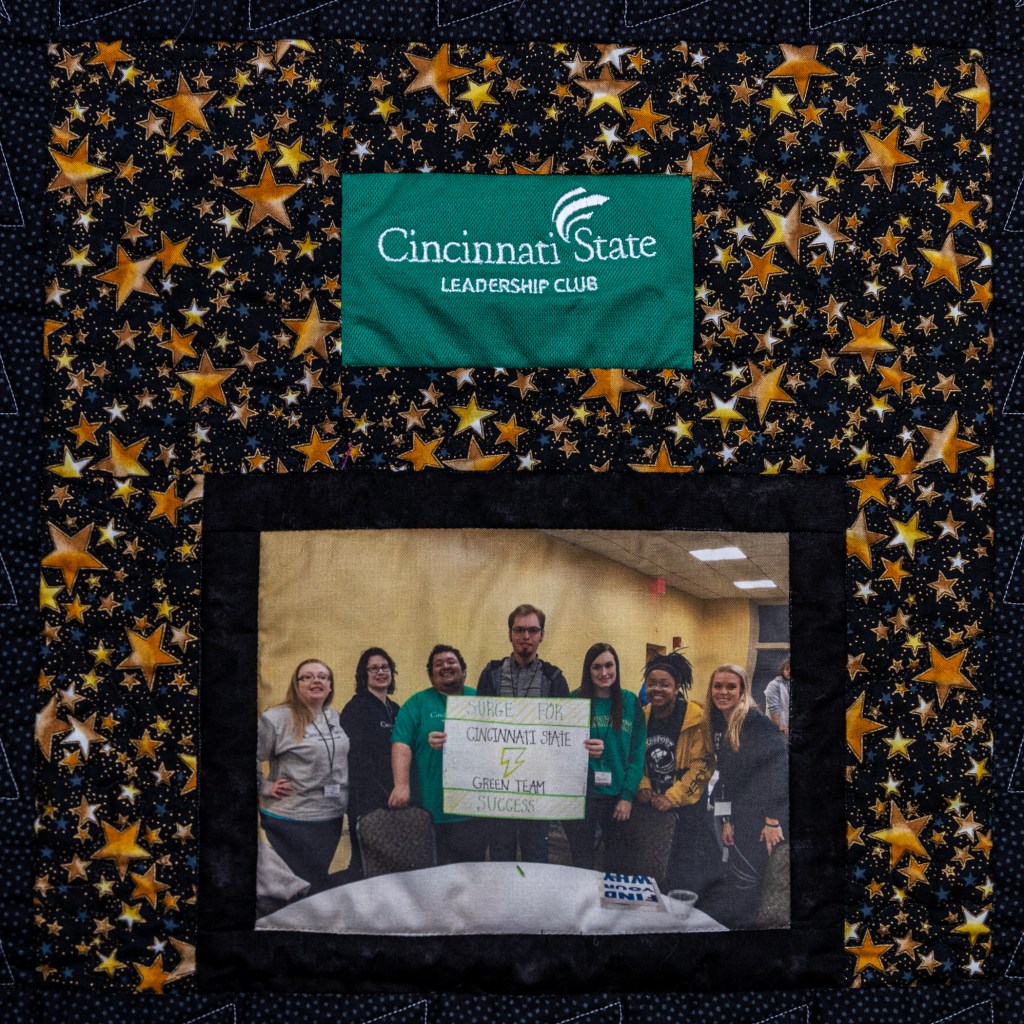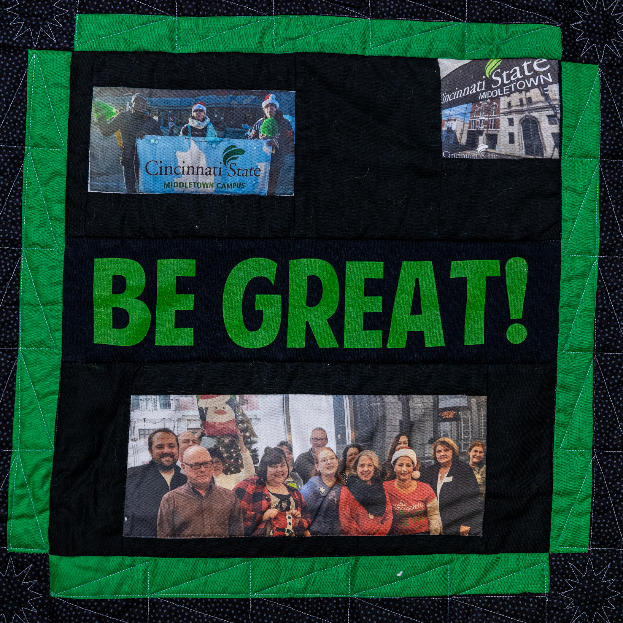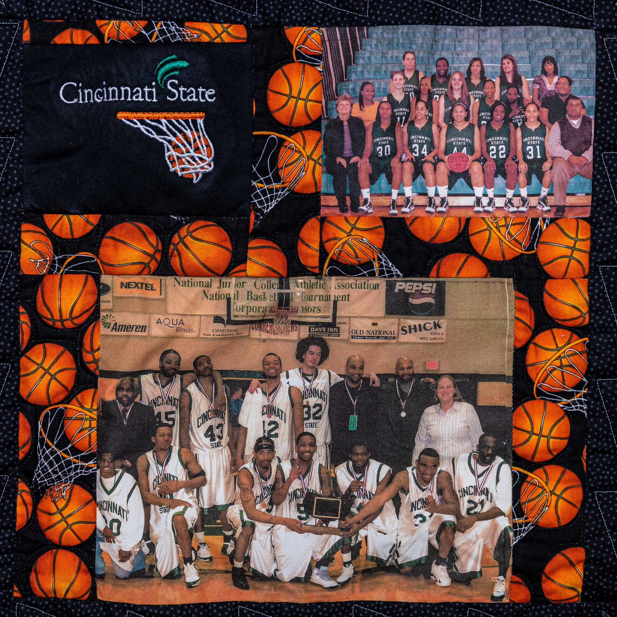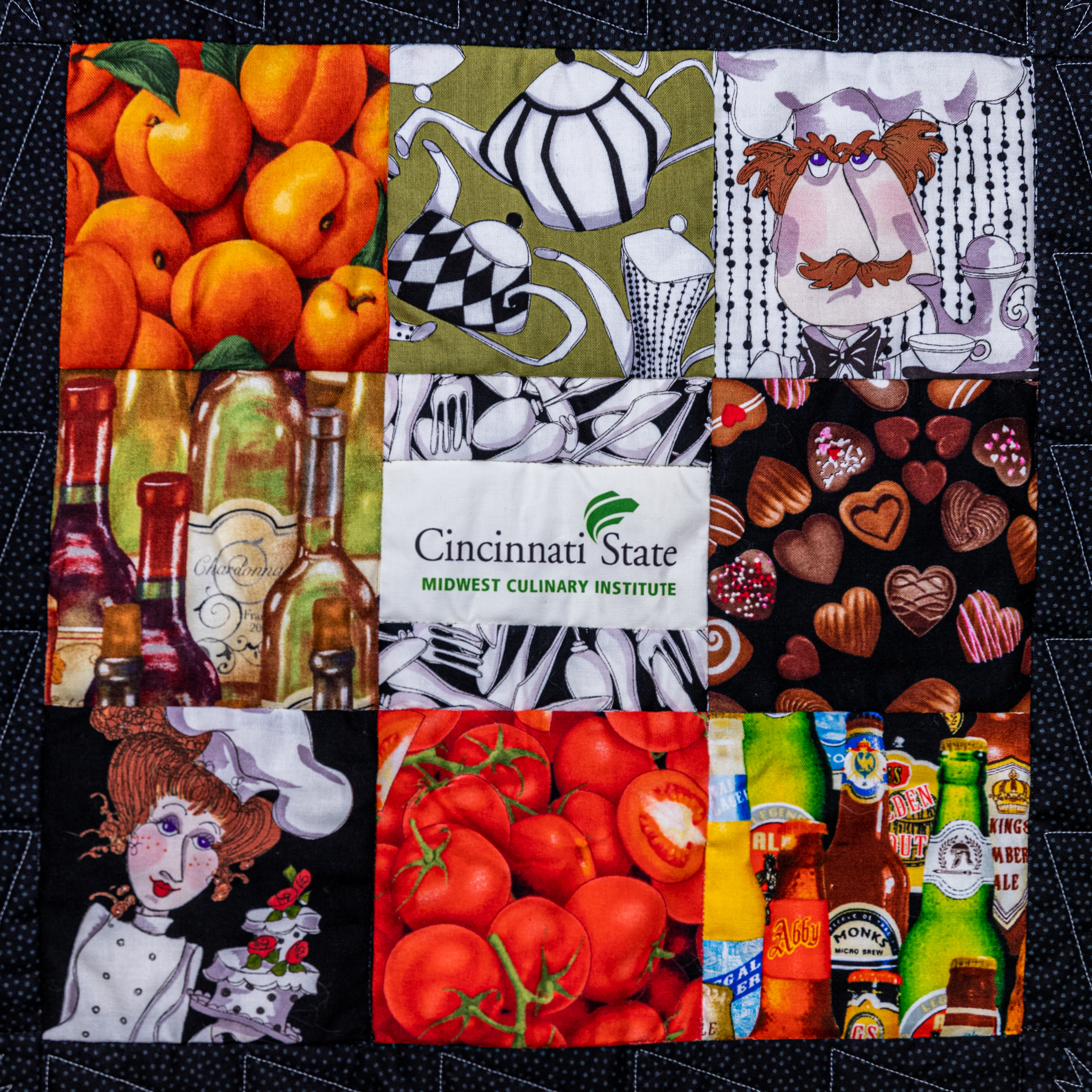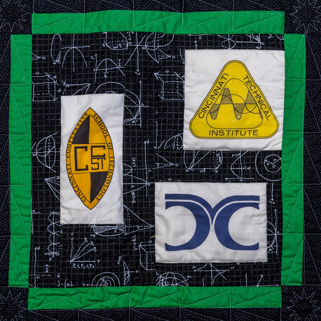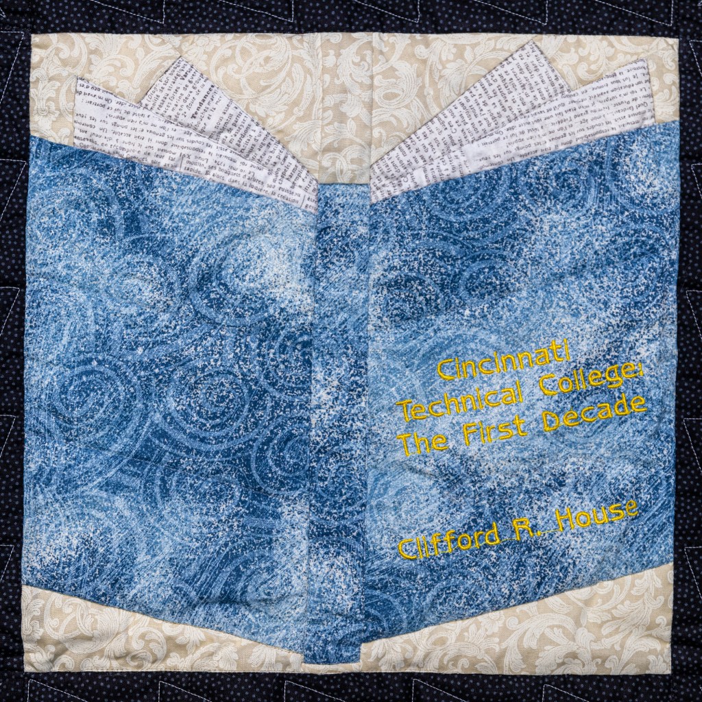 Early Childhood Parent Resource Center created 2019. Made by Sandi OwensEarly Childhood Education Degree Program NAEYC Accreditation 2018. Made by Sandi OwensIt’s a Great Day at Cincinnati State embroidered block. Made by Debbie BogenschutzFounder Tom Stark and His Family of Alumni photograph and embroidery with scientific background fabrics. Designed by his daughter Kristi Stark Drout and made by Debbie BogenschutzA circuit board representing the Engineering Technologies Division. Made by Debbie Bogenschutz who remembers many ET students working on their circuit boards in the Library.2019 Cincinnati State Collegiate Leadership Competition (CLC) Green Team. We were the only two-year college that competed in Cleveland in 2019 and gave all the four-year schools stiff competition. Photograph provided by Julie McLaughlin, Chair. Made by Diane StumpA pieced helicopter representing the Aviation Program. Made by Diane Stump.Photo of the Eileen Berke Occupational Therapy Center with embroidery. Made by Claudia Miller, Chair of the OTA Program.Nursing: Providing Ladders to Success and listing the programs provided. Made by Alice Palmer, retired Program Chair.William H. Mallory Early Learning Center established 1987 and NAEYC accredited. Made by Sandi OwensScience Olympiad 1990-2006 featuring photos of the various competitions. Designed by Peggy Rolfsen and made by Debbie Bogenschutz.The Midwest Culinary Institute logo surrounded by fabrics representing many aspects of the programs. Made by Joyce Rimlinger in consultation with Betsy Lasorella.Photos of the Tutoring Center featuring Debbie Greenlee and various working tutors. Made by Diane Stump.Memories of the Men’s and Women’s Basketball teams with photos, a logo, and basketball fabric. Inspired by Theresa Check former Athletic Director and made by Diane Stump.Flowers and Bees representing the Horticulture Program and our beautiful grounds. Made by Diane Stump.Fabric found by Cindy Kief on a mission trip which represents Occupational Therapy success.Many Facets of the Library with hand embroidery representing both books and technology available through the library. Made by Karen Douglas of the Cincinnati State Library.A pieced Mortar Board with a Cincinnati State tassel representing the success of out mission. Made by Debbie BogenschutzThe Be Great Logo with photos of the Middletown staff and building provided by Tom Hale and Dave Beeman. Made by Joyce RimlingerThe Cincinnati State Library over the years with photos from various moments in time and samples of library handouts as background fabric. Made by Debbie Bogenschutz.Leadership Certificate tee shirt provided by Julie McLaughlin. Block made by Diane StumpThe Accounting Program represented by faculty photos and handouts provided by Yvonne Baker. Assembled by Joyce RimlingerCapitol C made of chemical elements fabric on a background of letters by Gail Hale-Griffin, Financial AidEarth Day tee shirt provided by Ann Gunkle, Chair of the Environmental Technologies Program. Block assembled by Joyce RimlingerAmerican Association of University Professor logos from polo shirts and the newsletter spanning the history of the AAUP. Logos and shirts provided by Pam Ecker; the block was pieced by Joyce RimlingerCincinnati State Middletown Campus Be Great tee shirt logo. Made by Joyce RimlingerSeveral Cincinnati State logos with fabrics representing liberal arts and sciences offerings. Made by Joyce RimlingerCelebrating SO Years made with embroidery on fabric by Debbie Bogenschutz.Cincinnati Cooperative School of Technology, Cincinnati Technical Institute, and Cincinnati Technical College logos provided by Pam Ecker and pieced with “technical” fabric by Joyce RimlingerCincinnati State National Championship Golf team photo with a background of golf fabric made by Diane StumpThe Switchboard our long-time communications hub using a photo and various fabrics. Made by Carolyn LaRose, retired long-time switchboard operator.Cincinnati Technical College: The First Decade by Clifford House is represented in a book block with embroidered title and author. Made by Debbie Bogenschutz.The Financial Aid process featuring the FASFA logo and various fabrics. Made by Destiny Howard of the Financial Aid Office.Cincinnati Police Academy housed on the Cincinnati Technical College Campus from July 31, 1972 to June 25, 1993, using police insignia and embroidery. Made by a friend at the direction of Tom Bauer.The First Year Experience using insignia from several shirts and a photograph of Julie Mclaughlin, Chair, and Diarie Stump, Founder and Chair. Made by Diane Stump