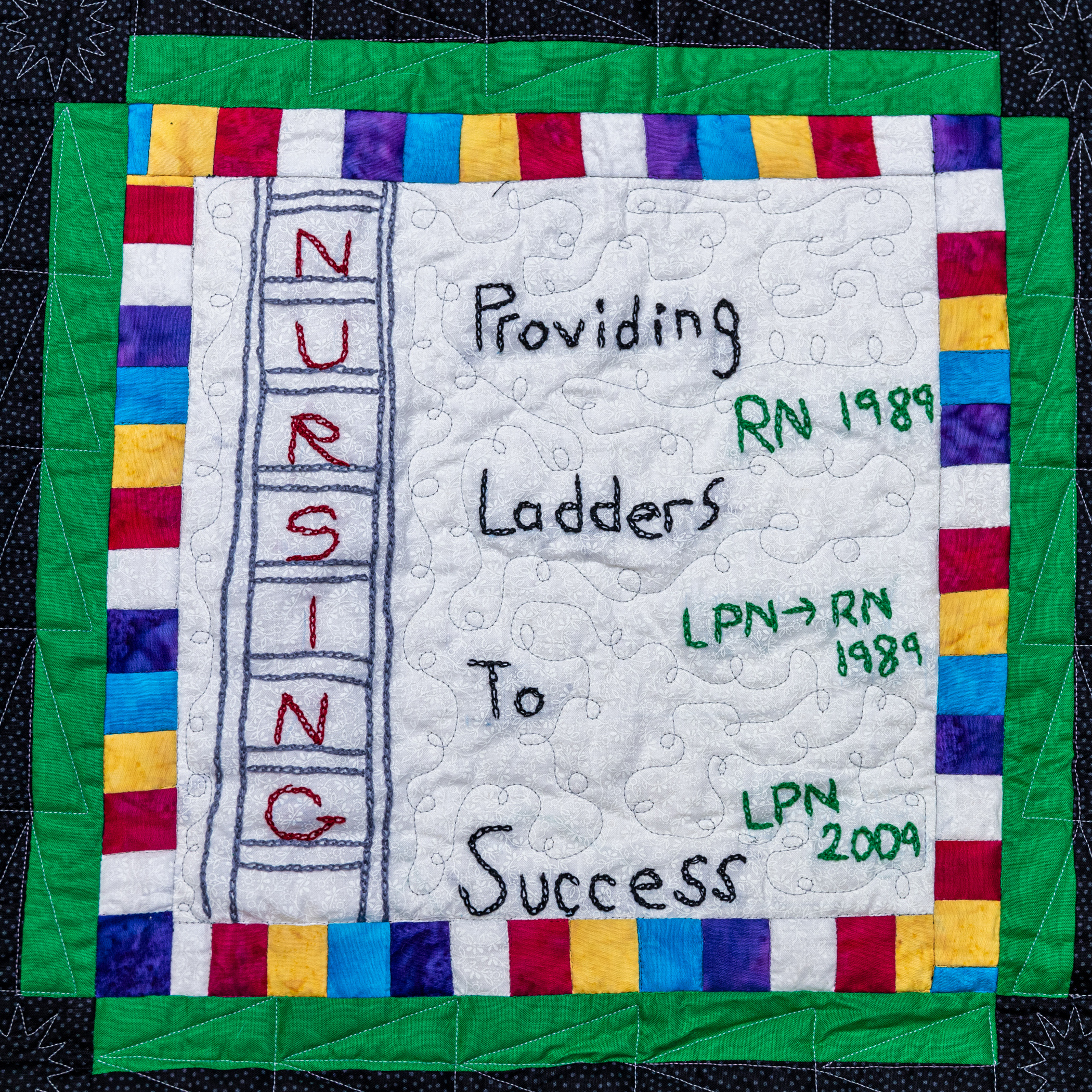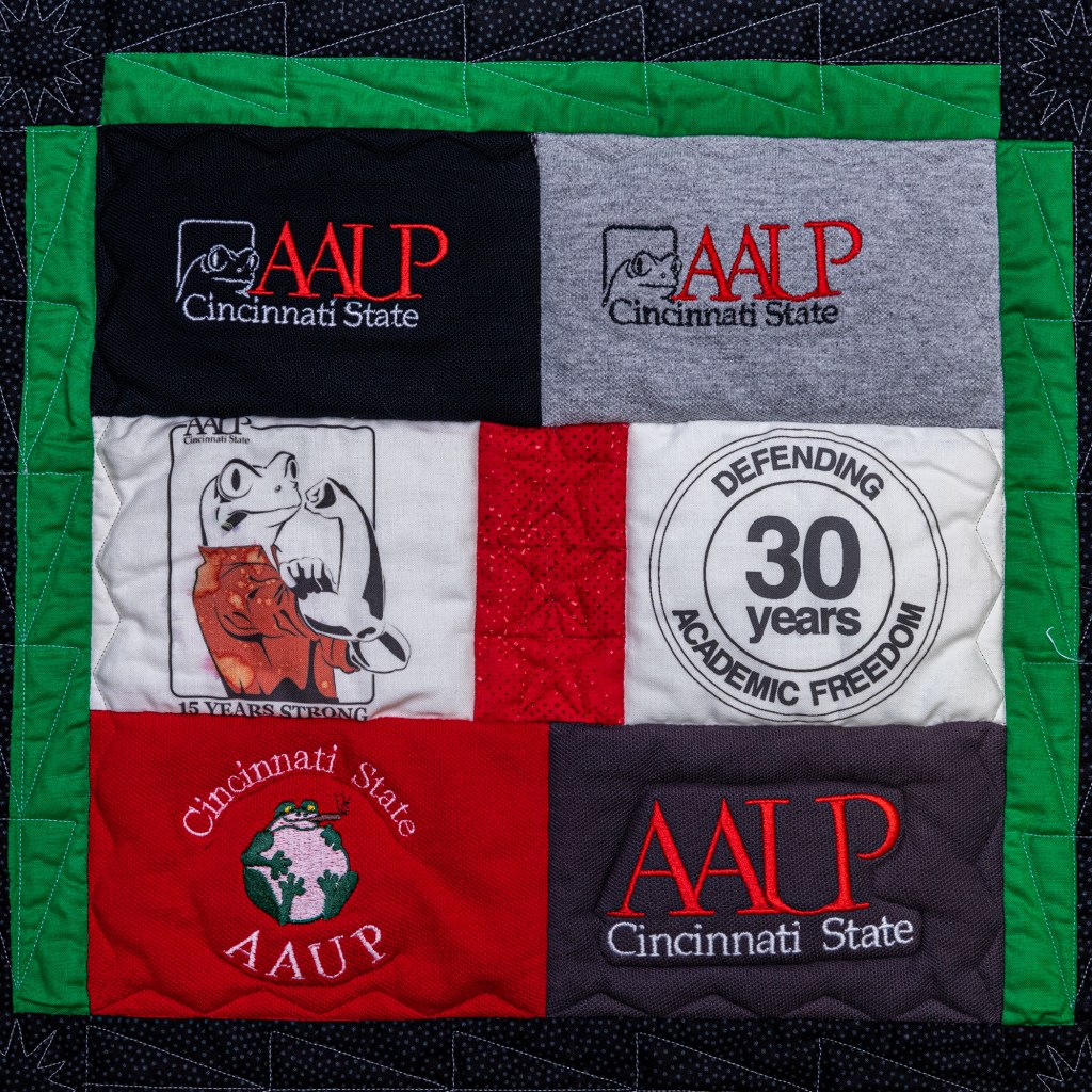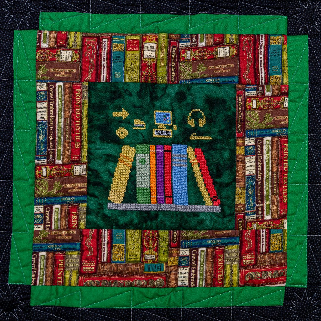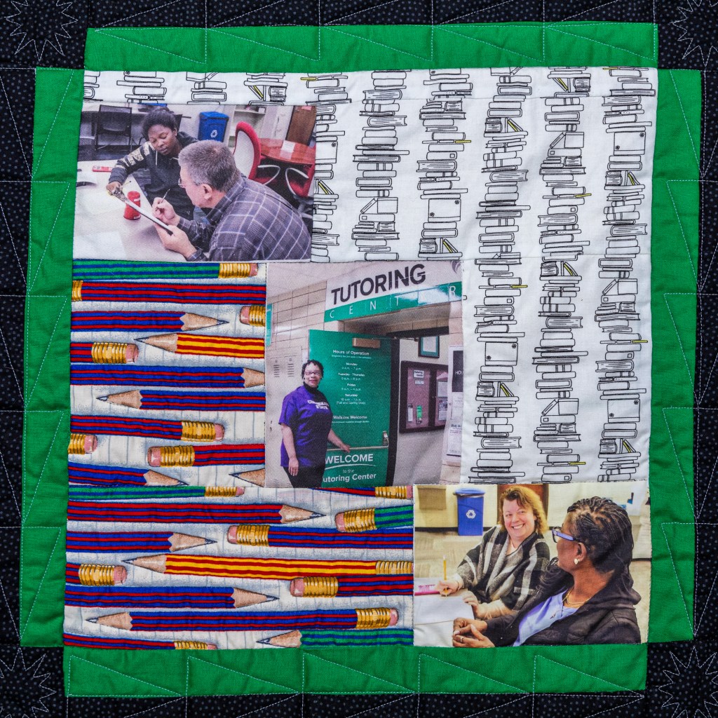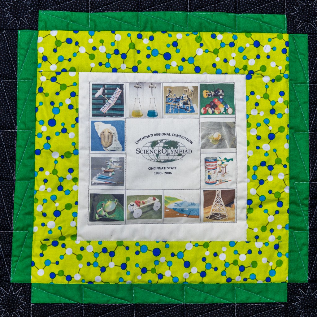 Early Childhood Parent Resource Center created 2019. Made by Sandi OwensEarly Childhood Education Degree Program NAEYC Accreditation 2018. Made by Sandi OwensIt’s a Great Day at Cincinnati State embroidered block. Made by Debbie BogenschutzFounder Tom Stark and His Family of Alumni photograph and embroidery with scientific background fabrics. Designed by his daughter Kristi Stark Drout and made by Debbie BogenschutzA circuit board representing the Engineering Technologies Division. Made by Debbie Bogenschutz who remembers many ET students working on their circuit boards in the Library.2019 Cincinnati State Collegiate Leadership Competition (CLC) Green Team. We were the only two-year college that competed in Cleveland in 2019 and gave all the four-year schools stiff competition. Photograph provided by Julie McLaughlin, Chair. Made by Diane StumpA pieced helicopter representing the Aviation Program. Made by Diane Stump.Photo of the Eileen Berke Occupational Therapy Center with embroidery. Made by Claudia Miller, Chair of the OTA Program.Nursing: Providing Ladders to Success and listing the programs provided. Made by Alice Palmer, retired Program Chair.William H. Mallory Early Learning Center established 1987 and NAEYC accredited. Made by Sandi OwensScience Olympiad 1990-2006 featuring photos of the various competitions. Designed by Peggy Rolfsen and made by Debbie Bogenschutz.The Midwest Culinary Institute logo surrounded by fabrics representing many aspects of the programs. Made by Joyce Rimlinger in consultation with Betsy Lasorella.Photos of the Tutoring Center featuring Debbie Greenlee and various working tutors. Made by Diane Stump.Memories of the Men’s and Women’s Basketball teams with photos, a logo, and basketball fabric. Inspired by Theresa Check former Athletic Director and made by Diane Stump.Flowers and Bees representing the Horticulture Program and our beautiful grounds. Made by Diane Stump.Fabric found by Cindy Kief on a mission trip which represents Occupational Therapy success.Many Facets of the Library with hand embroidery representing both books and technology available through the library. Made by Karen Douglas of the Cincinnati State Library.A pieced Mortar Board with a Cincinnati State tassel representing the success of out mission. Made by Debbie BogenschutzThe Be Great Logo with photos of the Middletown staff and building provided by Tom Hale and Dave Beeman. Made by Joyce RimlingerThe Cincinnati State Library over the years with photos from various moments in time and samples of library handouts as background fabric. Made by Debbie Bogenschutz.Leadership Certificate tee shirt provided by Julie McLaughlin. Block made by Diane StumpThe Accounting Program represented by faculty photos and handouts provided by Yvonne Baker. Assembled by Joyce RimlingerCapitol C made of chemical elements fabric on a background of letters by Gail Hale-Griffin, Financial AidEarth Day tee shirt provided by Ann Gunkle, Chair of the Environmental Technologies Program. Block assembled by Joyce RimlingerAmerican Association of University Professor logos from polo shirts and the newsletter spanning the history of the AAUP. Logos and shirts provided by Pam Ecker; the block was pieced by Joyce RimlingerCincinnati State Middletown Campus Be Great tee shirt logo. Made by Joyce RimlingerSeveral Cincinnati State logos with fabrics representing liberal arts and sciences offerings. Made by Joyce RimlingerCelebrating SO Years made with embroidery on fabric by Debbie Bogenschutz.Cincinnati Cooperative School of Technology, Cincinnati Technical Institute, and Cincinnati Technical College logos provided by Pam Ecker and pieced with “technical” fabric by Joyce RimlingerCincinnati State National Championship Golf team photo with a background of golf fabric made by Diane StumpThe Switchboard our long-time communications hub using a photo and various fabrics. Made by Carolyn LaRose, retired long-time switchboard operator.Cincinnati Technical College: The First Decade by Clifford House is represented in a book block with embroidered title and author. Made by Debbie Bogenschutz.The Financial Aid process featuring the FASFA logo and various fabrics. Made by Destiny Howard of the Financial Aid Office.Cincinnati Police Academy housed on the Cincinnati Technical College Campus from July 31, 1972 to June 25, 1993, using police insignia and embroidery. Made by a friend at the direction of Tom Bauer.The First Year Experience using insignia from several shirts and a photograph of Julie Mclaughlin, Chair, and Diarie Stump, Founder and Chair. Made by Diane Stump