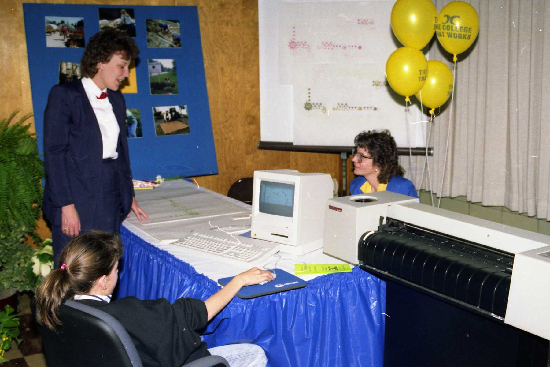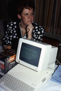 Gaby Boeckermann, CTC faculty, at Expo II with Apple IIc Computer, ca. 1986