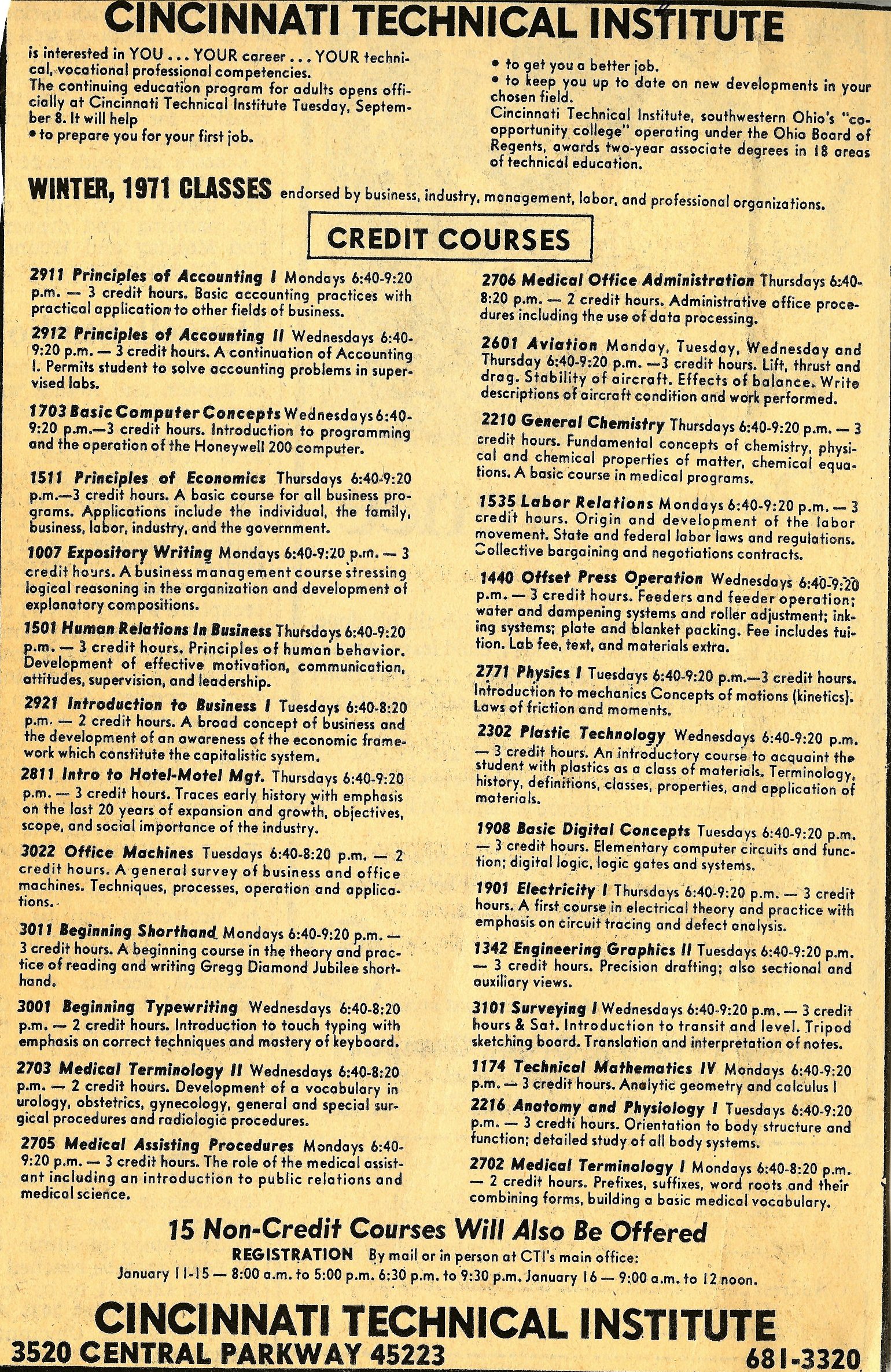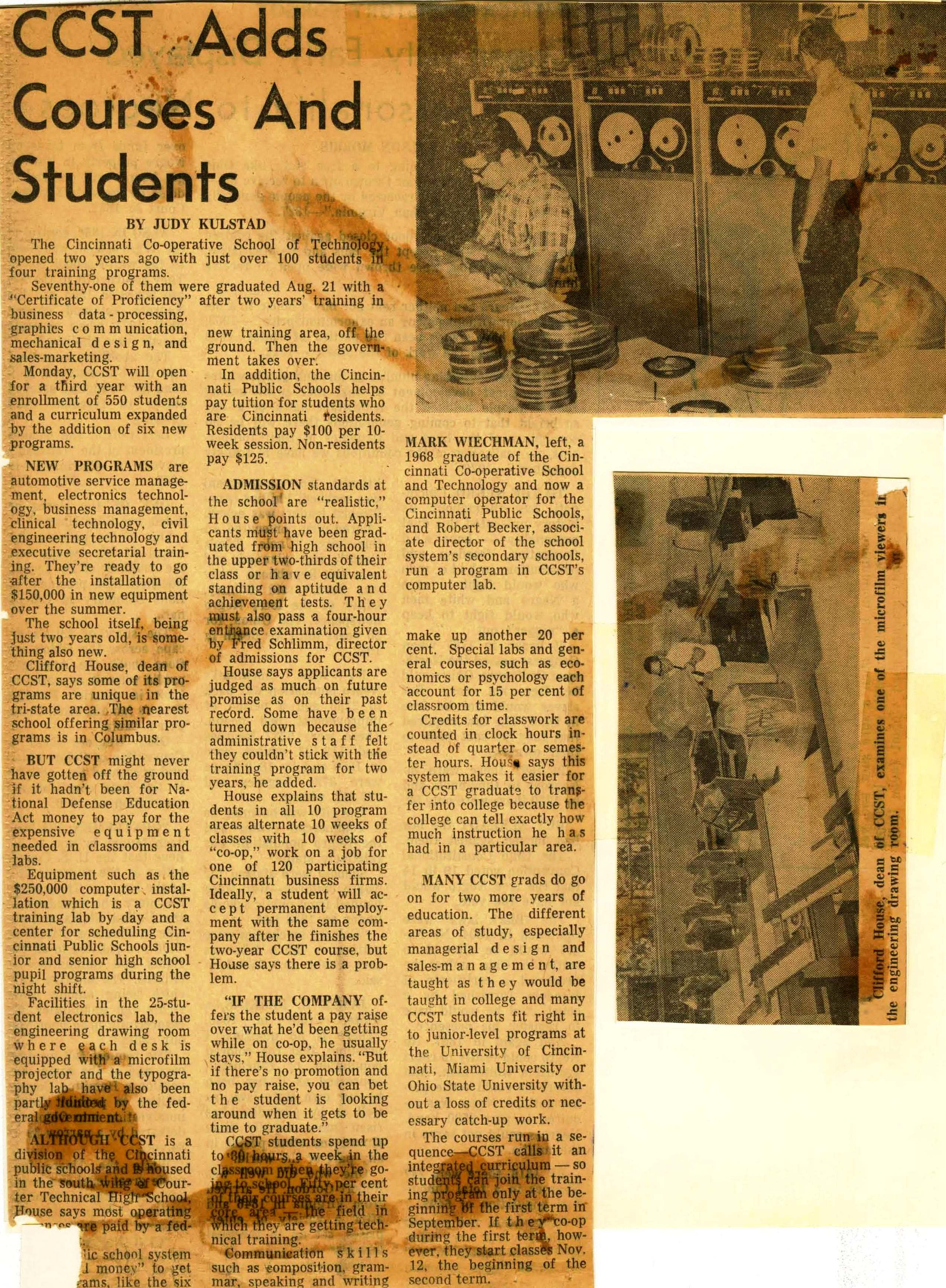 1966: the Cincinnati Cooperative School of Technology opened its doors, offering course in 4 programs: Sales Marketing Technology; Graphic Printing Technology; Business Data Processing; Mechanical Design.