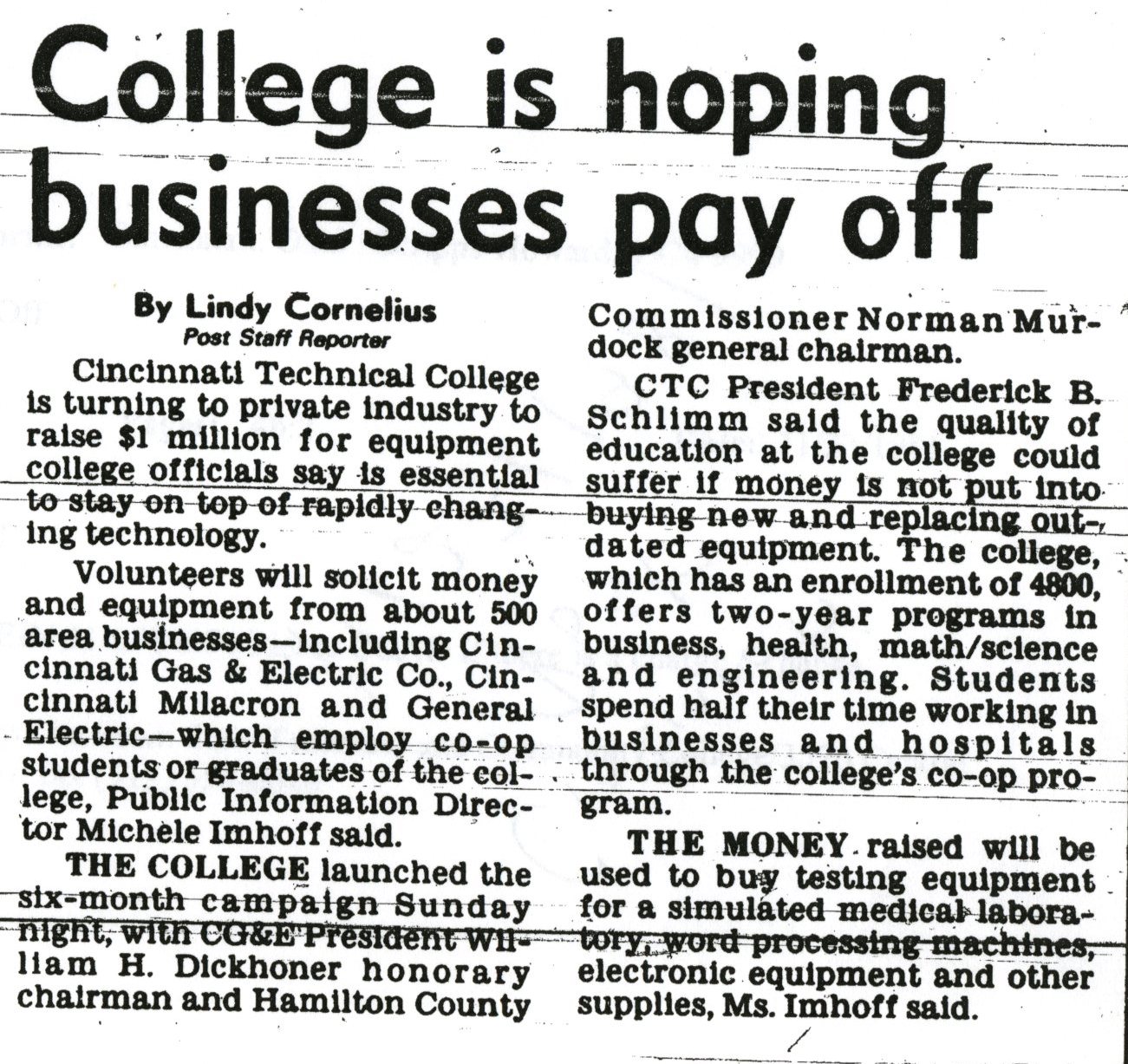 1981: CTC turned to private industry for financial support for the first time with the launch of the $1 Million Select Campaign. The goal was exceeded in 1983. The money was to be used to replace outdated technology.