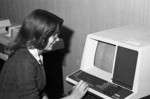 unidentified student demonstrating one of the school’s new computers, the Hazeltine 1510, ca. 1977. The Hazeltine 1510 terminal was an upgraded version of the Hazeltine 1500 terminal and was introduced in June, 1977 for $1,395.