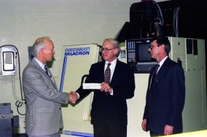 Cincinnati Milacron (then Cincinnati Milling Machine) was one of the first cooperative employers back in 1966, and remains a valued partner in co-op education today. Pictured: An unidentified man with Pres. Jim Long and Larry Morris, c. 1990