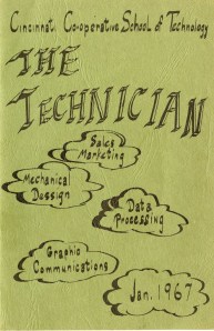 The school, then part of Cincinnati Public Schools, opened in 1966 with 100 students in four programs: Business Data Processing; Sales Marketing; Graphic Communications Management; Engineering Drafting. There were 38 cooperative employers. Pictured: The cover of The Technician, 1967