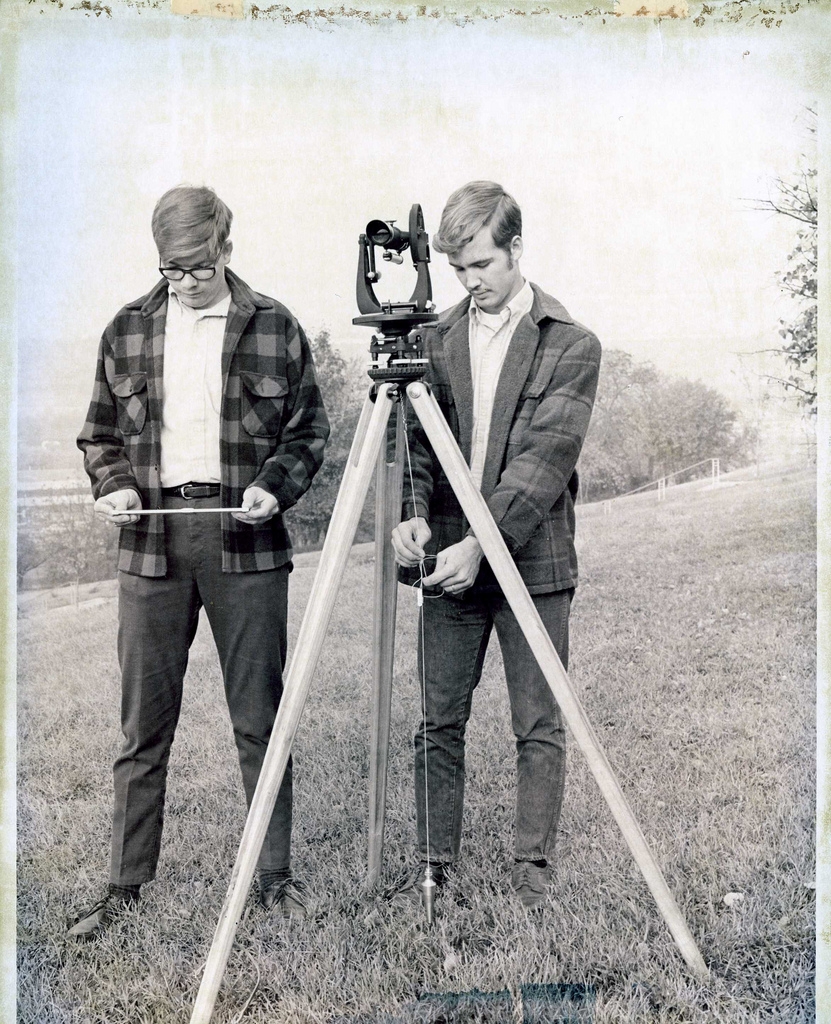 In 3 years the school had expanded to 550 students, and added 6 departments: automotive service management; electronics technology; business management; clinical technology; civil engineering technology; executive secretarial training. Undated photo shows two Civil Engineering students.
