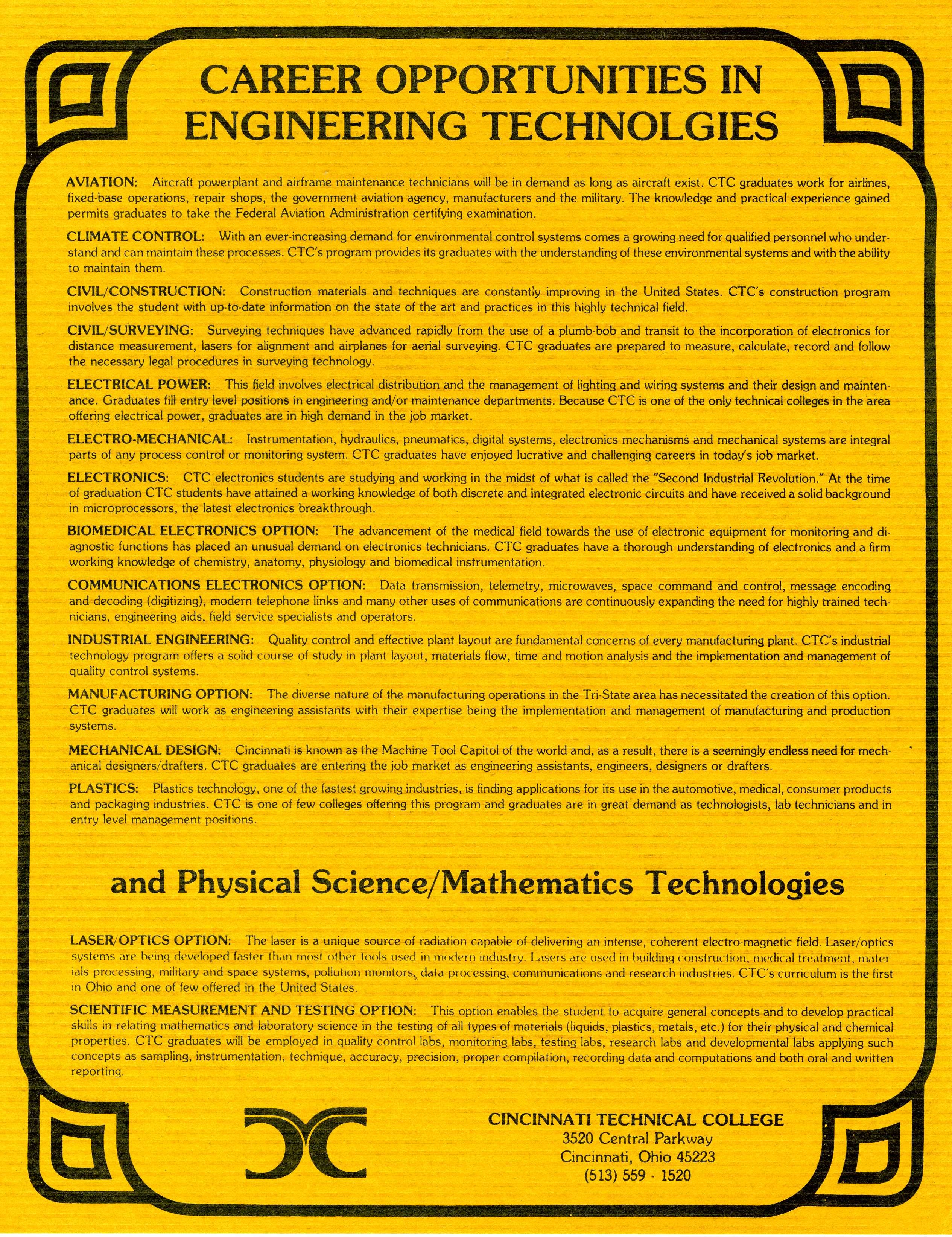 Today the four divisions of study offered are: Health and Public Safety, Humanities and Sciences, Business Technologies, and the Center for Innovative Technologies. This exhibit examines the programs offered by the Center for Innovative Technologies division of degrees offered at Cincinnati State Technical and Community College which emerged in the 2006-2007 academic year. It merged the degrees that were once offered in the Engineering Technologies Division, Information & Engineering Technologies Division, and the Information Technologies Division into one.