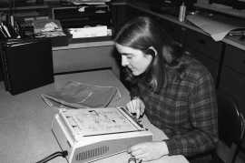 Lucy Logan, former co-op in Media Services (Production) using a Page Reader. The pages contained a magnetic strip with recorded audio information about the topic.