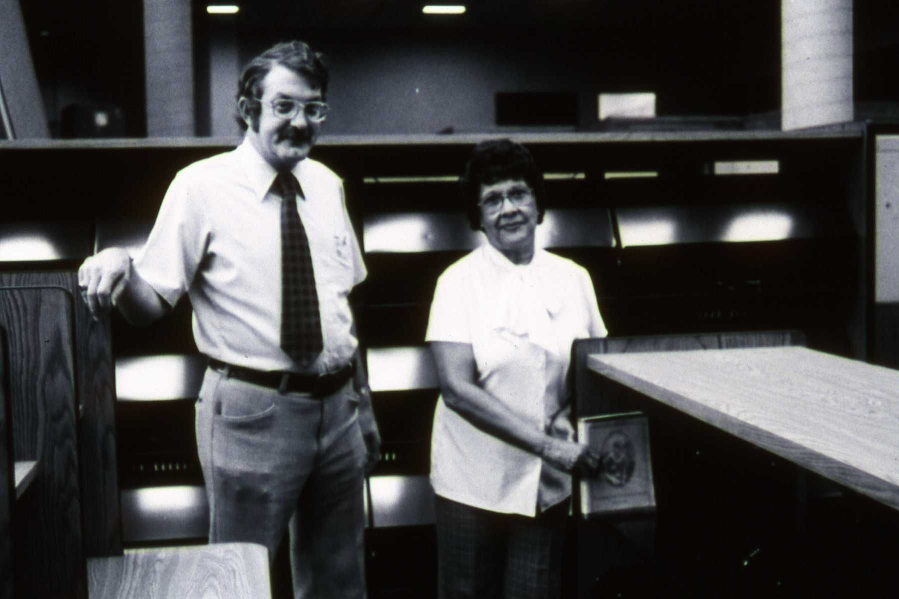 In September 1978, the new LRC opened to the public. In this picture, President Frederick Schlimm watches Johnnie Mae Berry place the first library book on the shelf.