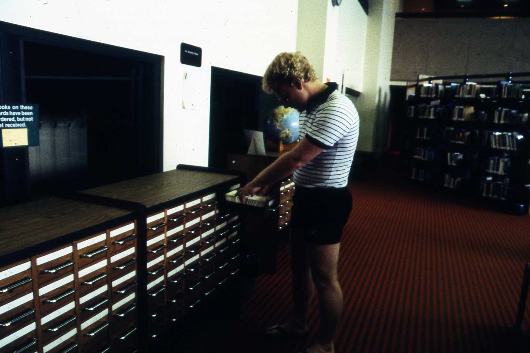 Throughout the 1970s, 1980s, and early 1990s, the collections, services, and staff of the LRC continued to grow. Patrons continued to access information via printed indexes and a card catalog. This picture shows a student using the card catalog sometime in the 1980s.